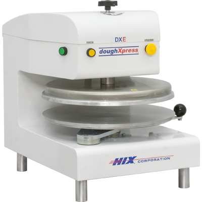 (10218) Pizza Dough Press, electro-mechanical automatic, up to 18″ diameter, uncoated aluminum platens, upper platen heat up to 200° F, digital time & temperature controls, infinite range thickness adjustment, illuminated power on/off button, two start buttons, emergency stop button, white finish, 120v/60/1-ph, 10 amp, 1150 watts, NEMA 5-15P, cETLus, ETL-Sanitation, Made in USA