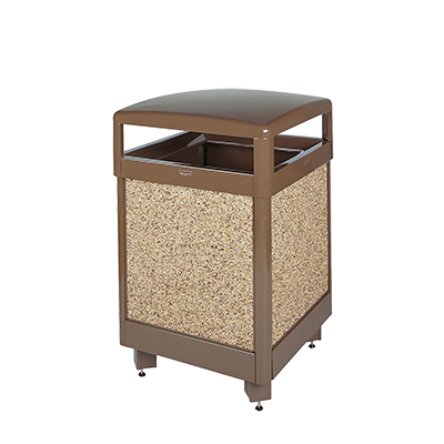 Aspen Waste Receptacle, 38 gallon, 26″ square x 40″H, hinged top, rigid plastic liner, steel/stone panel construction, outdoor, brown with desert brown stone panels (12 weeks lead time), Made in USABrand: Rubbermaid Commercial Products