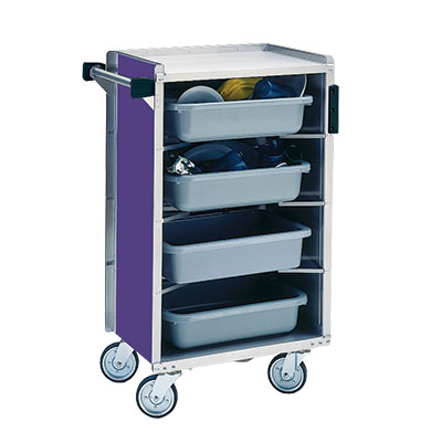 Bussing Cart, enclosed back & sides, (4) shelf, shelf size 16″ x 22″, stainless steel shelves, vinyl cabinet, stainless steel angle frame with push handle, allergen-safe purple laminated exterior, 5″ swivel casters, 500 lb. capacity, Made in USA (contact factory for price)
