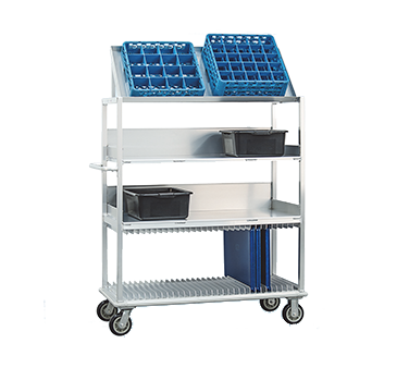 Bussing Station, mobile, 55-1/2″L x 25-3/4″D x 76-1/2″H, 15″ shelf clearance, drying rack 1-1/2″ angle spacing, accommodates glass racks, bus tubs, 18″ x 26″ sheet pans, 13″ x 18″ or 14″ x 18″ trays, all welded aluminum construction, aluminum tubular frame with push handle, full perimeter bumper, (4) 6″ x 2″ casters, (2) rigid & (2) swivel (Custom Product, contact factory for price and details), Made in USA