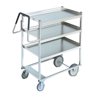 Cart, 650 pound capacity with RAISED Lower Shelf, 1″ square stainless steel tube frame, (3) 16 ga stainless steel 20″ x 30″shelves & 3/4″ exterior ht Handle with plastic coating, heli-arc welds, (2) 5″ swivel casters with brakes (300#), (2) 8″ casters (700#), 39″ x 20″ x 44-1/2″, USA