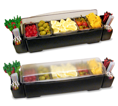 Co-Rect Products® – Bar Condiment and Garnish Station, (4) 1 quart inserts, (1) 2 quart insert, black tray, clear roll back lidBrand: Crown Brands, LLC