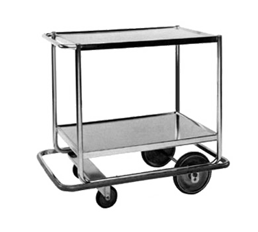 Deluxe Tray Service/Utility Hand Truck, (2) solid shelves with marine edge, open base, shelf size: 23-1/8″ x 34-1/8″, (1) push handle, wrap around bumper, 1-1/4″ dia. tubing, heli-arc welded stainless steel, polished, (2) 5″ swivel casters & (2) 10″ load wheels, NSF
