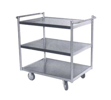 Deluxe Utility Cart, (3) solid shelves, open base, shelf size: 23″ x 34″, 650 lb. capacity, (2) push handles, 1-1/4″ dia. tubing, heli-arc welded stainless steel, polished, 5″ casters (2 swivel, 2 rigid), NSF