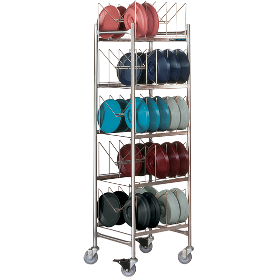 Drying & Storage Rack, stainless steel, for Smart-Therm™ bases, holds 180 induction bases, 1″ square stainless steel tubing frame construction, welded tray slides, 5″ casters (2 with brakes) (IBDRS/180)Brand: Dinex
