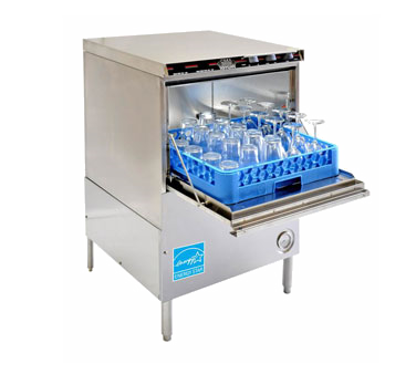 Energy Mizer® Glasswasher, undercounter, 24″W x 25″D x 39″H, hot water (180°F) sanitizing, built-in Safe-T-Temp booster heater with 70°F rise, (30) racks/hour, 180°F final rinse safety system for proper final rinse temperature, upper & lower stainless steel arms, digital LED temperature gauges & top mounted controls, auto fill feature, detergent & rinse chemical pumps, gravity drain system, stainless steel construction, uses standard 19-3/4″ x 19-3/4″ glass racks, 11-1/4″ door clearance, 6″ legs, includes (1) open & (1) peg rack, 1 HP wash pump, ENERGY STAR®, NSF, cULus