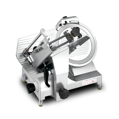 Heavy Duty Slicer, manual, full size, gravity feed, 12″ dia., max. slice thickness 1/2″, large food hopper, stainless steel hollow ground knife, top mounted sharpener, 1/2 HP, 110v/60/1-ph, ETL, ETL-SanitationBrand: Skyfood Equipment