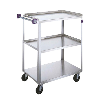 Medium Duty Utility Cart, 3-tier, open base, 500 lbs capacity, 21″ x 35″ shelf size, 13-3/8″ shelf clearance, sound deadening panels, (1) push handle with bumpers, (2) bumpers on front legs, allergen-safe purple bumpers, galvanized steel dolly frame, welded stainless steel construction, 5″ swivel casters with non-marking polyurethane tread, Made in USA