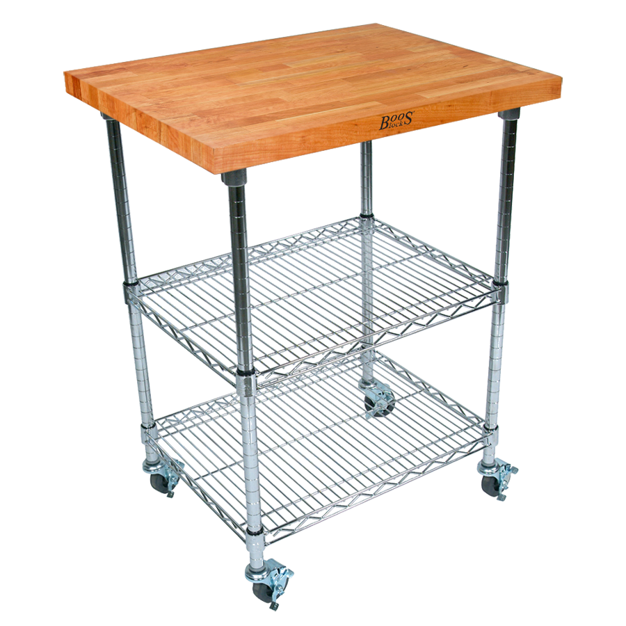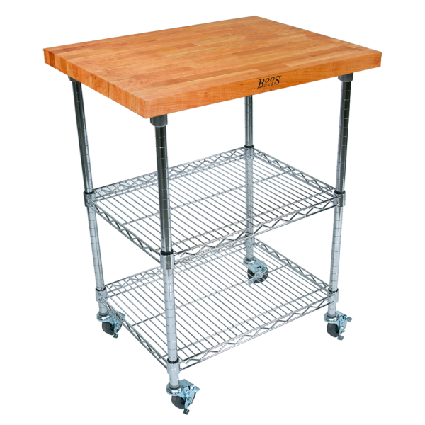 Metropolitan Wire Cart, 27″W x 21″D x 36″H overall size, 1-1/2″ thick blended top, American Cherry, with Varnique finish, (2) adjustable chrome wire shelves, 3″ locking caster, KDBrand: John Boos
