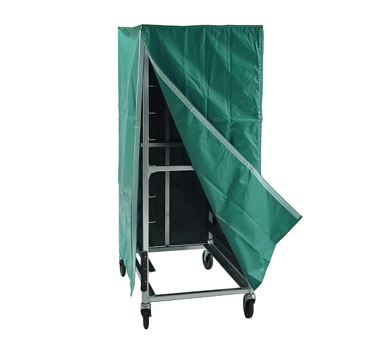 Room Service Delivery Cart, 23″L x 31-1/4″W x 59-1/4″H, holds (20) 15″ x 20″ trays, 5″ spacing, “staph check” cover, vertical corner bumpers at the bottom, vertical pan stop, all-welded aluminum construction, (4) 5″ stem swivel casters, NSF, Made in USA