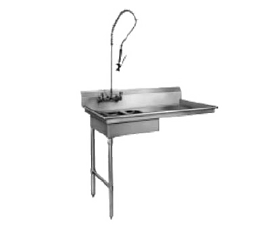 Soiled Dishtable, undercounter, 48″W x 29″D x 42-3/4″H, 16/304 stainless steel top, 8″H backsplash, 20″ x 20″ x 5″ deep pre-rinse sink on left, 8″ OC splash mount faucet holes, 2″ basket drain, raised rolled edges on front & sides, stainless steel legs & adjustable side bracing, NSF