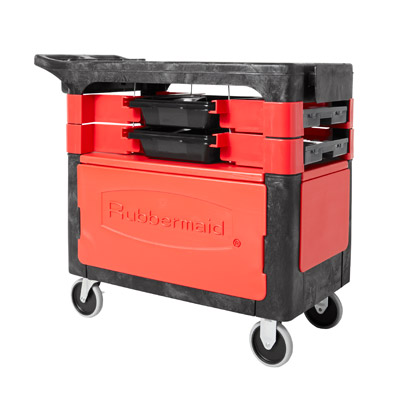 Trades Cart, 38″L x 19-1/4″W x 33-3/8″H, (2) shelves, (1) compartment, (2) parts boxes, (4) parts bins, with locking cabinet, 180 lb. top shelf capacity, 150 lb. bottom shelf capacity, (4) 5″ casters, assembly required, black, Made in USA