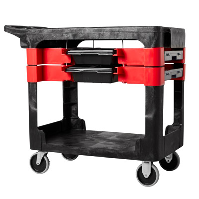 Trades Cart, 38″L x 19-1/4″W x 33-3/8″H, (2) shelves, open base, (2) parts boxes,(4) parts bins, 180 lb. top shelf capacity, 150 lb. bottom shelf capacity, (4) 5″ casters, assembly required, black, Made in USA