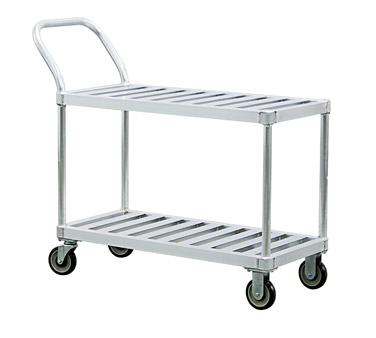 Utility Cart, (2) “T”-bar shelves, open base, shelf size approximately 19″ x 48″, 1000 lbs. capacity, aluminum tubular frame with push handle, (4) 5″ platform casters (2 swivel, 2 rigid), NSF, Made in USABrand: New Age