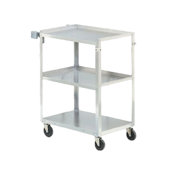 Utility Carts, 300 lb, cap., Stainless 3-Shelf Truck, shelves measure 17 3/4″ x 27″, unit measures 30 7/8″L x 17 3/4″W x 33 3/4″H, 13 13/16″ between shelves, 3-1/2″ swivel casters, 22 gauge shelves, 16 gauge uprights, Made in USA