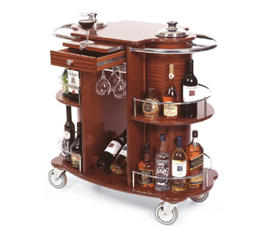 Wine/Liquor Cart-Bordeaux, 39-3/8″W x 19-5/8″D x 40-1/2″H, (2) recessed ice buckets, acrylic glass rack, pull-out shelf, drawer, removable bottle caddy, oval shaped top, (2) shelves, 304 stainless handles and rails, wood veneer overlay construction with satin varnish finish, 5″ plastic core wheel with non-marking rubber exterior (2 with brakes) (by Lakeside)