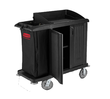 Xtra™ Housekeeping Cart, 49″L x 22″W x 50″H, compact cart with doors & vinyl bag, vacuum holder, rotating non-marking bumpers, assembly required, black, Made in USABrand: Rubbermaid Commercial Products